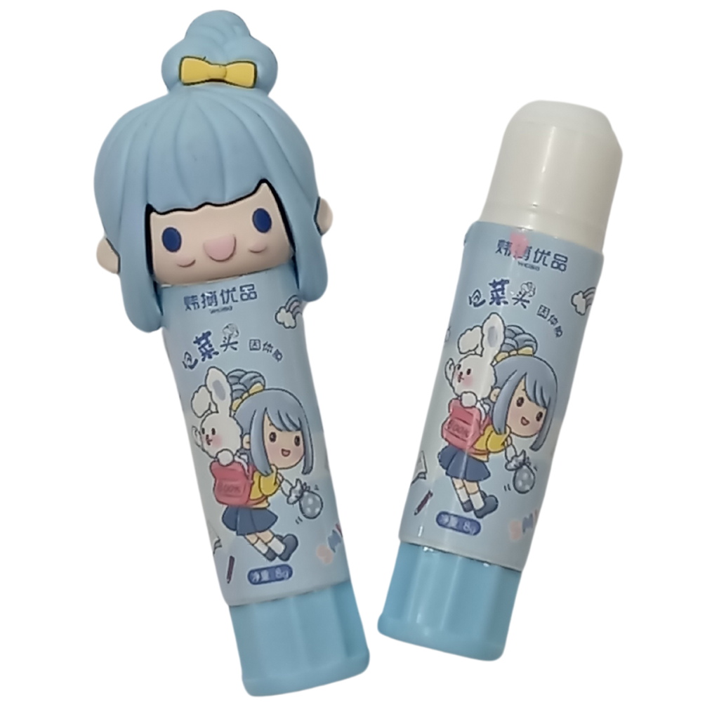 Design Kawaii: Uma tampa encantadora em formato de cabeça de menina que transforma qualquer atividade de colagem em um momento mais divertido.